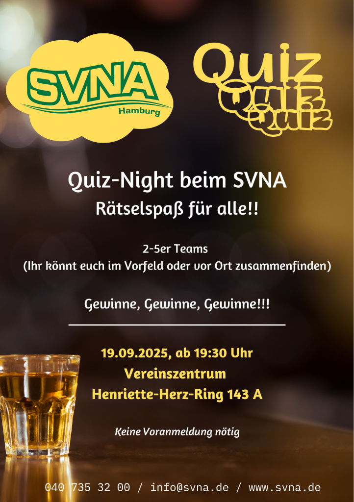 Der SVNA veranstaltet für erwachsene Rätsel- und Quizliebhaber am 19. September 2025 um 19:30 Uhr im Vereinszentrum Henriette-Herz-Ring 143A eine große Quiz-Night, bei der alle Teilnehmer in dreier bis fünfer Teams gegeneinander um verschiedenste Preise quizzen.