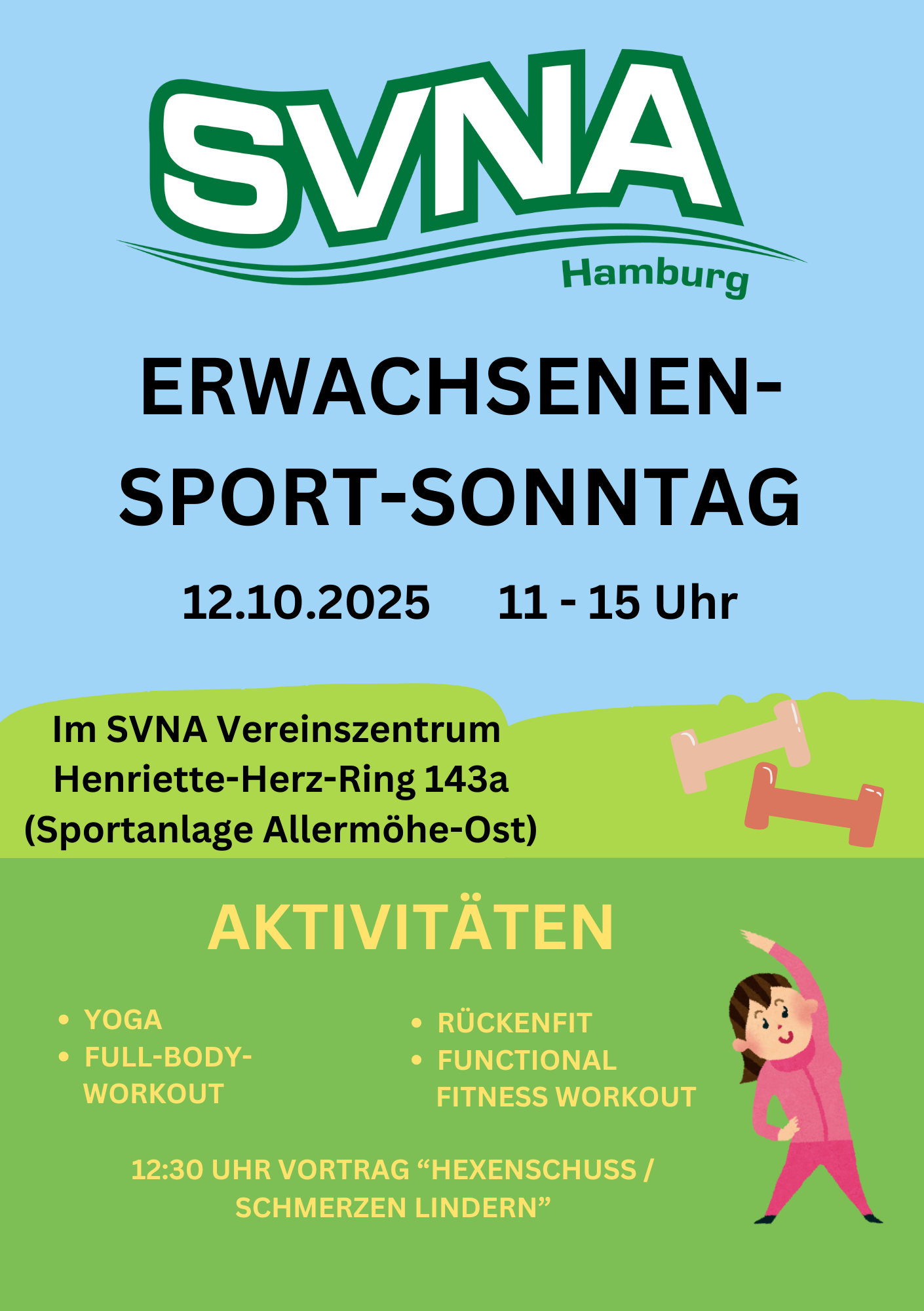 Am 12.10.2025 ist es wieder Zeit für den SVNA Erwachsenen-Sport-Sonntag! Von 11 - 15 Uhr finden bei uns im Vereinszentrum Allermöhe-Ost (Henriette-Herz-Ring 143a) verschiedene Schnupperkurse unserer Angebote statt und ihr … SVNA Erwachsenen-Sport-Sonntag weiterlesen